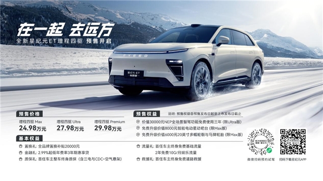 首款搭载该技术车型——全新星纪元ET增程四驱正式开启预售,共推出增程四驱Max、增程四驱Ultra、增程四驱Premium三款车型,预售价分别为:24.98万元、27.98万元及29.98万元,以雪豹四驱、黄金增程、猎鹰智驾3大硬核科技及8295芯片、电动遮阳帘、星动吧台等7大豪华配置升级,重新定义高端增程!